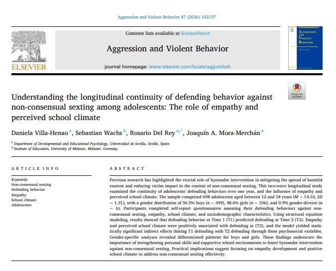 Investigaciones previas han destacado el papel crucial de la intervención de los espectadores para mitigar la difusión de contenido dañino y reducir el impacto en las víctimas en el contexto del sexting no consensual. Este estudio longitudinal de dos olas examinó la continuidad de las conductas de defensa de los adolescentes a lo largo de un año, y la influencia …